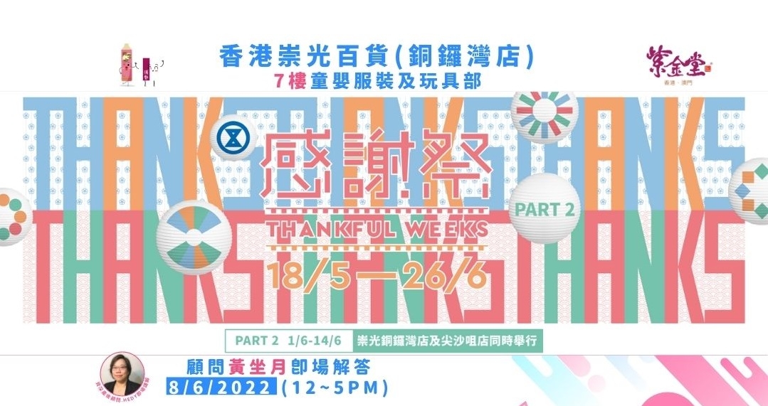 2022年6月8日 (下午12點 ~ 5點) 更會有【紫金堂】資深產後顧問~黃坐月 Hedy 在 崇光百貨(銅鑼灣店) 7樓母嬰用品部,為大家提供免費產前及坐月諮詢服務,有需要的產後、母乳媽媽或照顧產後媽媽的人士記得把握機會喇❤️
